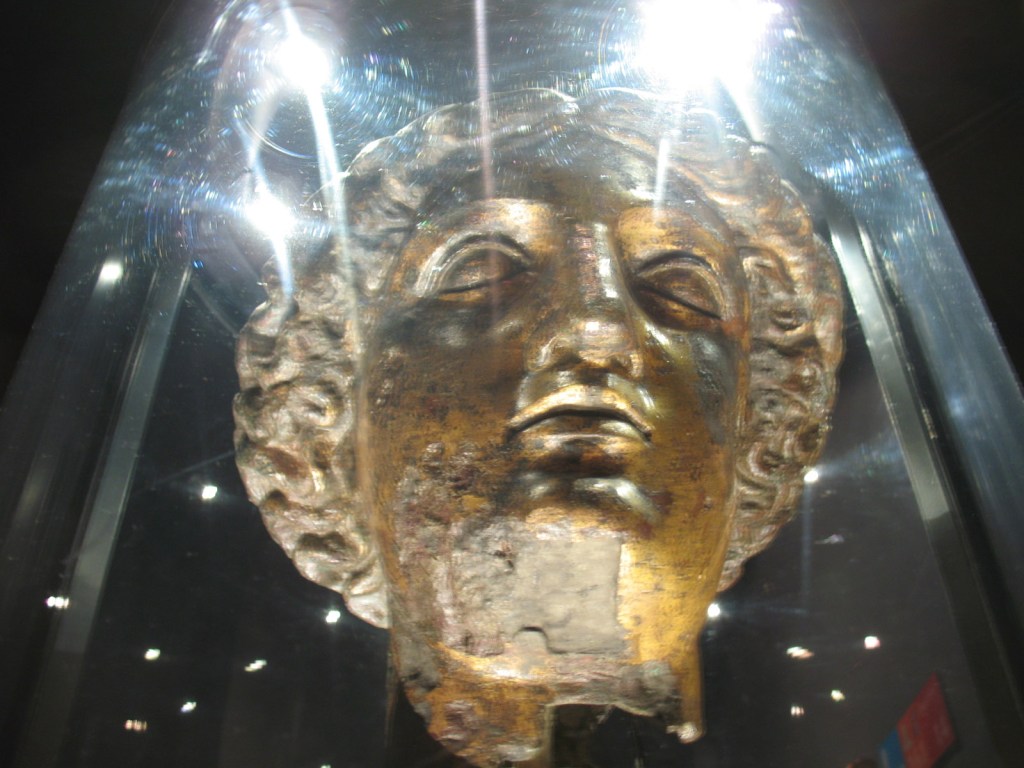 This golden bust of the goddess Sulis Minerva was one of many objects that had been thrown into the Sacred Spring, and was found again in the 18th century. It was after her that the Romans named the town “Aquae Sulis” – the waters of Sulis.