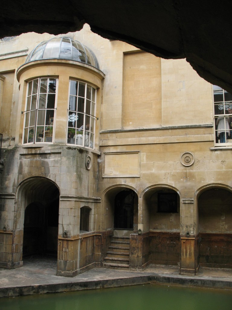 The Great Bath is one of a number of bathing pools in the complex, fed by the geothermally heated waters which bubble up from the Sacred Spring. The columns are a later addition having been built in Victorian times. The water is not safe for swimming in.