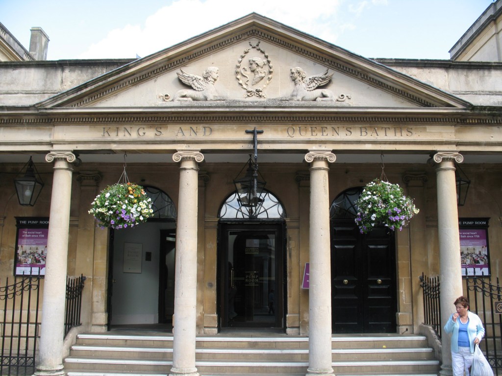 The west entrance to the Roman Baths, fronted with Victorian architecture.