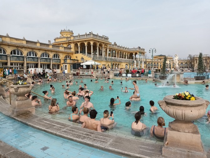 Just across from the castle is perhaps Budapest’s best known thermal bath, Széchenyi. It’s the largest in Europe and certainly the most impressive I’ve visited, ahead of those in Japan, Andorra, Canada and England. The baths opened in 1913 following the drilling of a well under the park nearly a kilometre down, and feature three outdoor and fifteen indoor pools of varying temperatures. There were no online tickets left when we arrived in country, but fortunately no queue at the baths themselves so it was easy to enter.