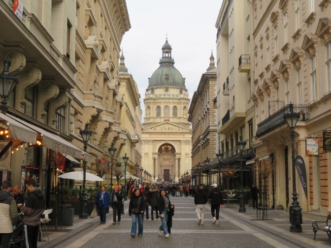 Saint Stephen’s Basilica is in a prominent position at the head of Zrinyi utca, lined with cafes and bars. It required two shots at construction, after the dome collapsed in 1858, but was finally completed in 1905 and is well worth a look inside, plus the climb up to the top of the dome which we did.