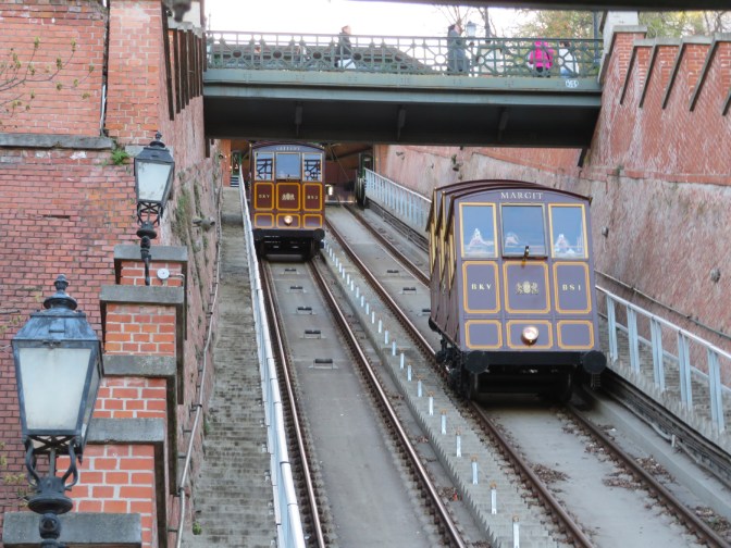 Why walk up to Buda Castle, when one can glide up by funicular? Because it costs £9 a ticket, that’s why. But we still did it as the queue was short, and it was mildly fun. The funicular was also bombed during the war and only rebuilt in the 1980s, following consideration of its replacement with escalators – a narrow escape. I’ve also enjoyed funiculars in Lisbon, Istanbul, Hong Kong, Cape Town and Kyiv, amongst others.