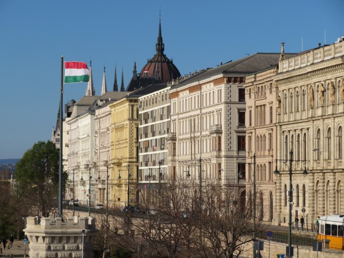 Looking upriver from Chain Bridge at examples of typical Budapest street architecture, together with the national flag.