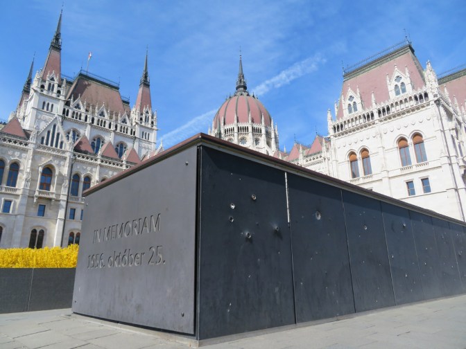 At the front of the Parliament building is the underground museum to the Hungarian Revolution of 1956, the uprising against the Soviets which almost succeeded before being crushed with the loss of several thousand lives. This is the entranceway although I’m uncertain whether the bullet holes are historical.