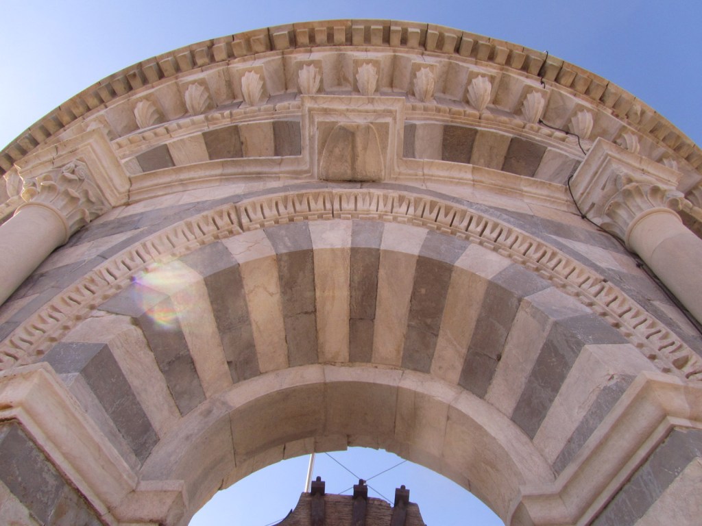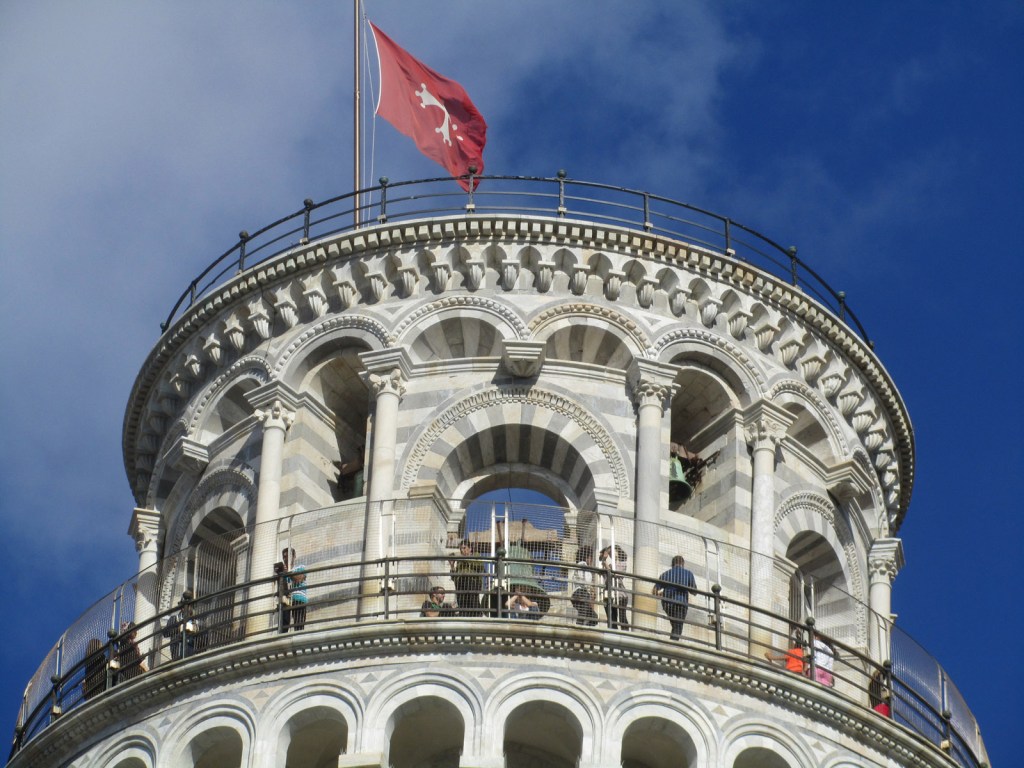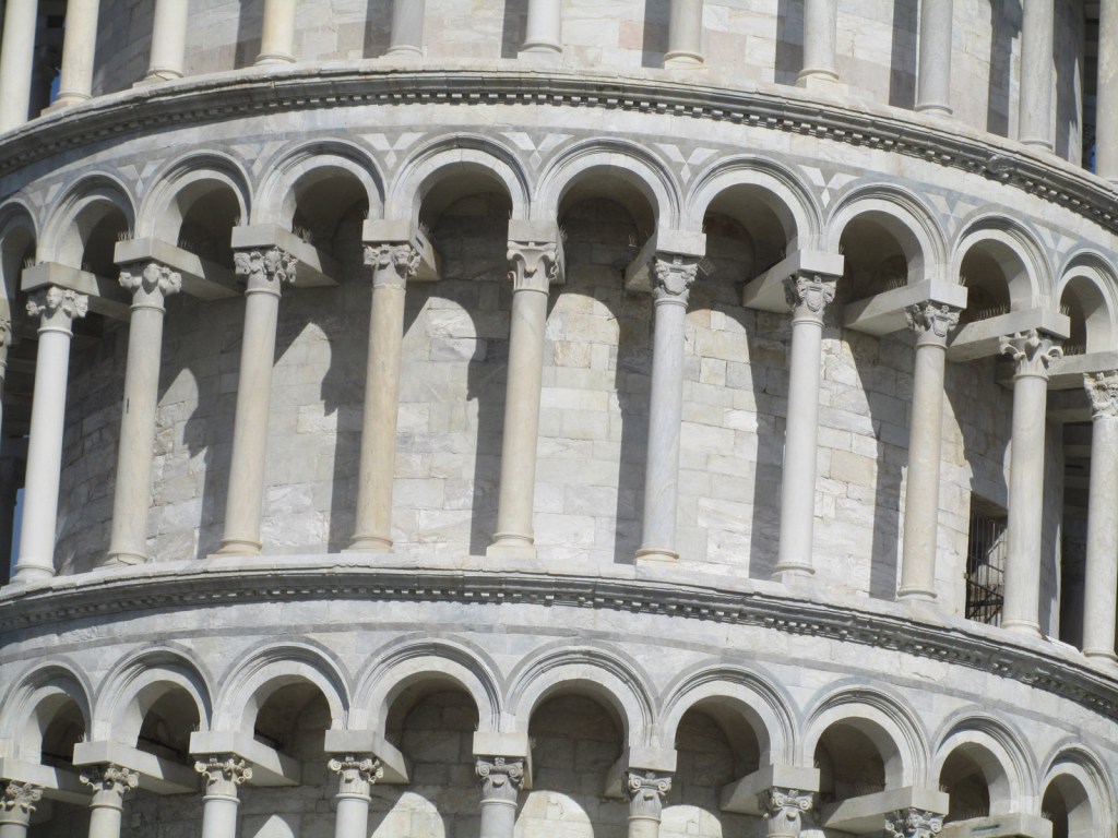 Detail of the marble blocks making up the tower’s crown, the beautiful white stone shone in the sun. The tower was closed during the whole decade of the 1990s, to slightly correct and arrest the lean, making it safe for cheerful tourists like me to traipse to the top once more.