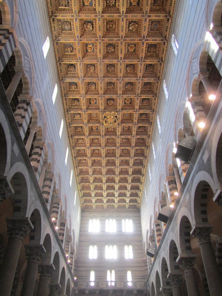 Inside Duomo di Pisa, and the richly panelled ceiling of the cathedral.