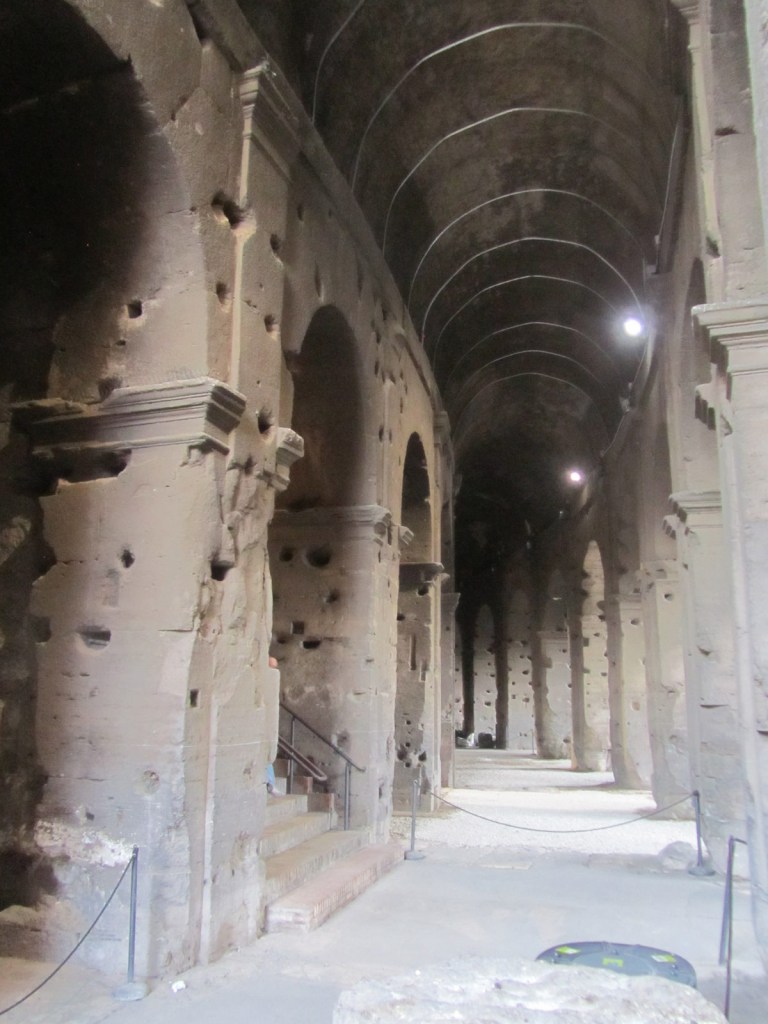 Inside the outer corridor on the way to our seats, or what was left of them. Even the lead used to fasten the stone blocks together has been pilfered over the years, leaving pock marks all over the structure.
