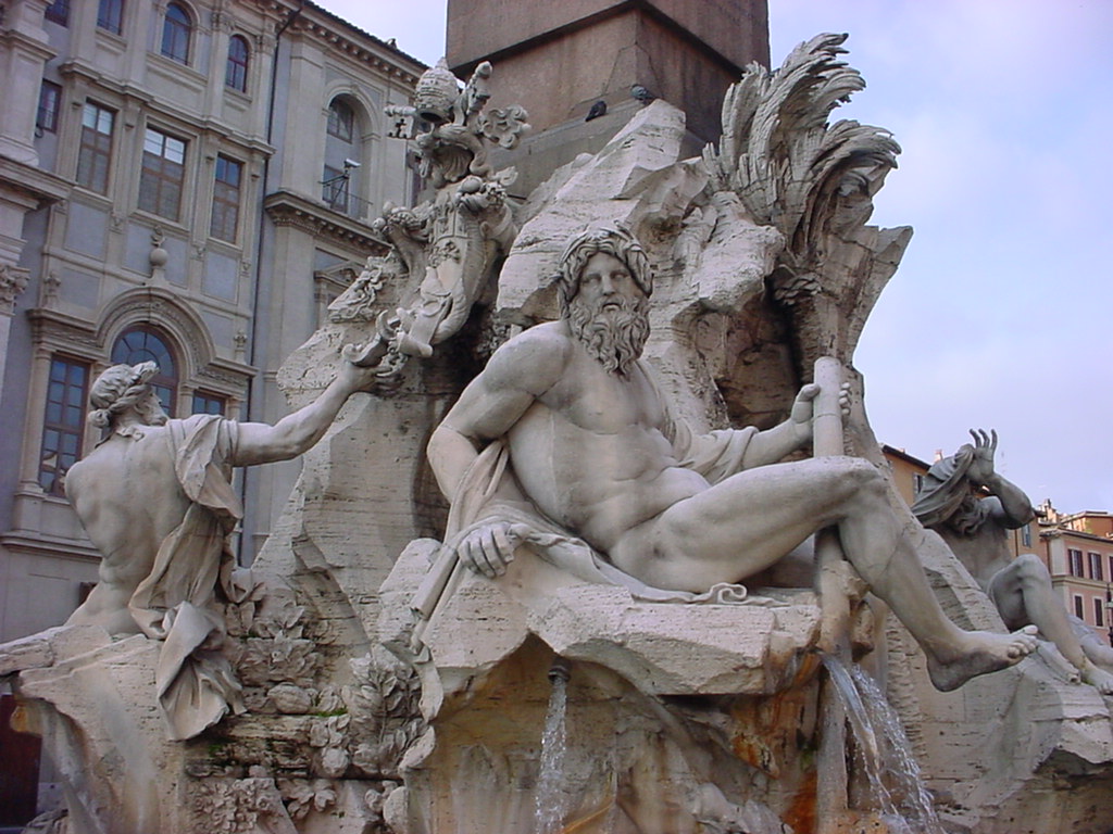 In Piazza Navona Bernini’s 17th century Fountain of Four Rivers stands in the middle of the square, crowned with an Ancient Egyptian obelisk. The figure on the right is shielding his eyes from gazing upon Bernini’s pupil Boromini’s building, as their relationship had gone from bad to worse.
