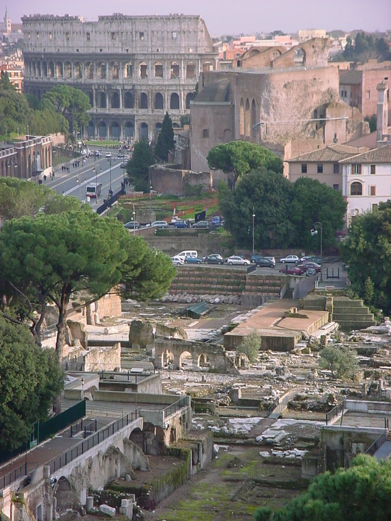 Trajan’s Forum as seen from the Vittoriano, was cut into Capitoline Hill and contained markets in addition to the still-intact Trajan’s Column.