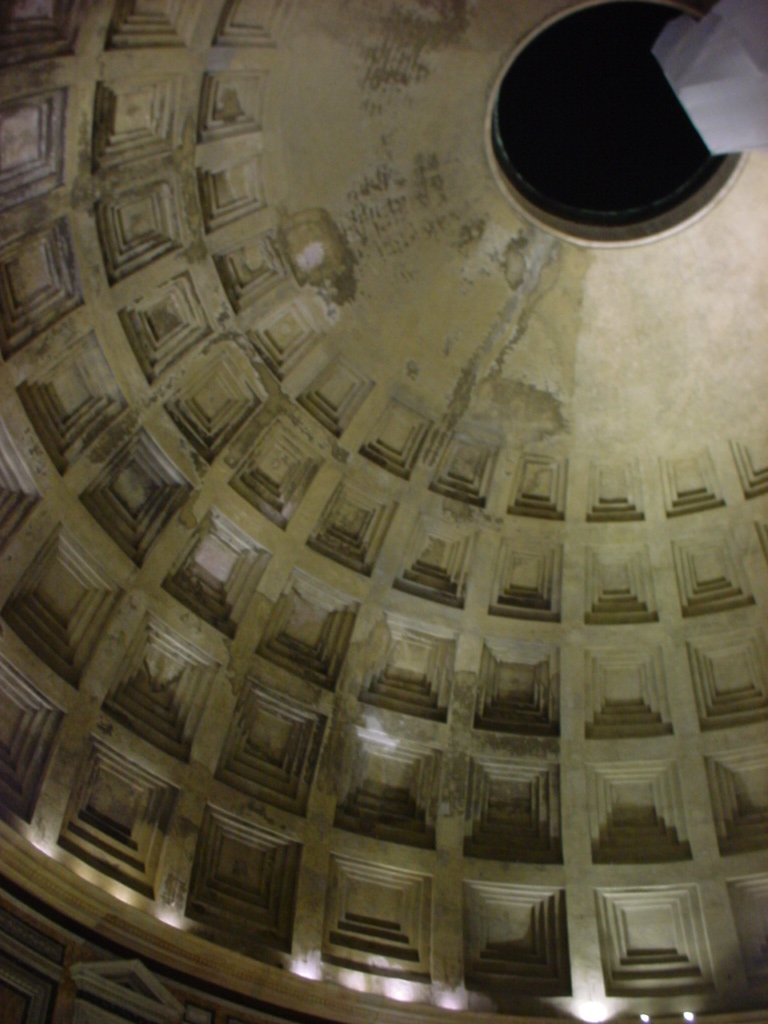 The Pantheon dome is made of increasingly lighter pumice-aggregate concrete, for each ring closer to the oculus in the centre. The oculus provides natural light and ventilation, and also further reduces the weight of the dome.