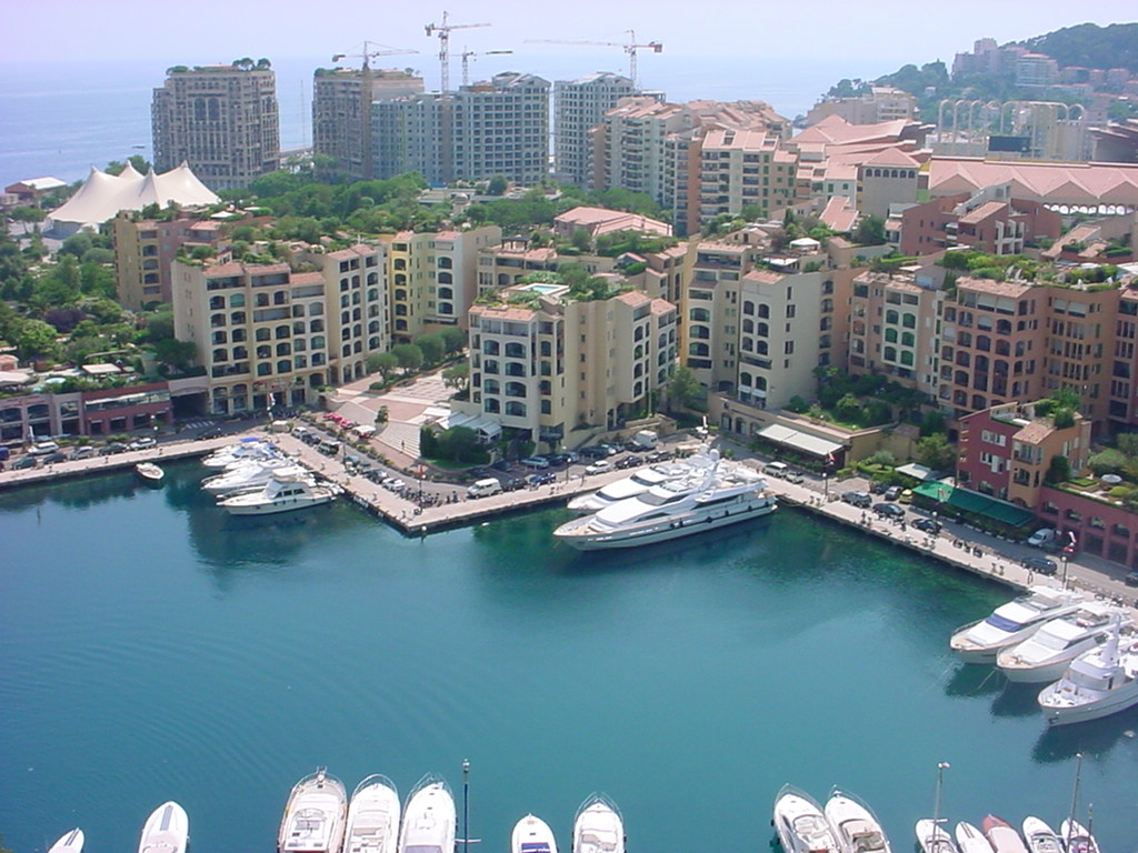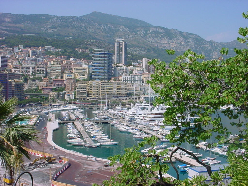 Port Hercules is studded with yachts and pleasure craft of all sizes, which double as viewing decks during the Grand Prix. The tallest apartment building in the background marks the border with France.