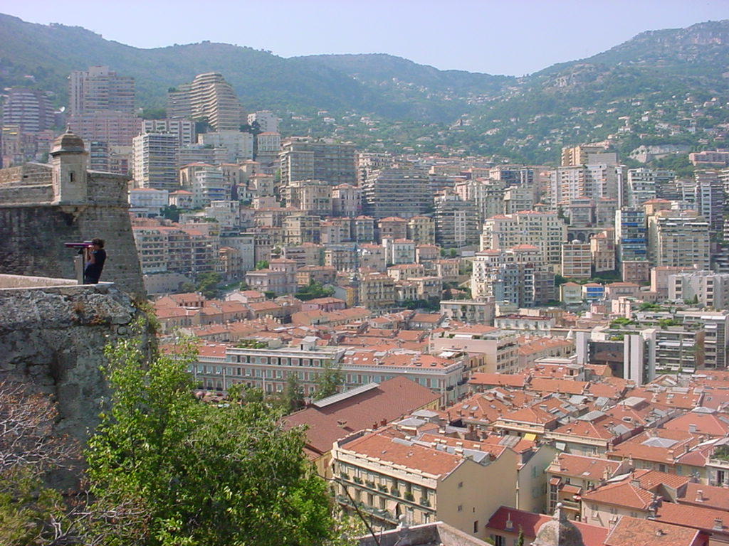 Looking from the palace away from the marina over the red roofs of the city. The tall apartments in the distance mark the border, and the mountains are of course all part of France.