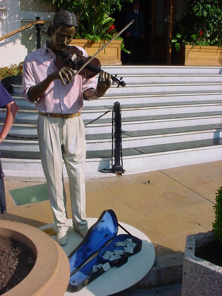 This busking chap is doing especially well, considering his fiddle strings are all broken, he hasn’t scraped out a single note, and his significant musical disadvantage of being cast in bronze. Yet look at his takings for the day!