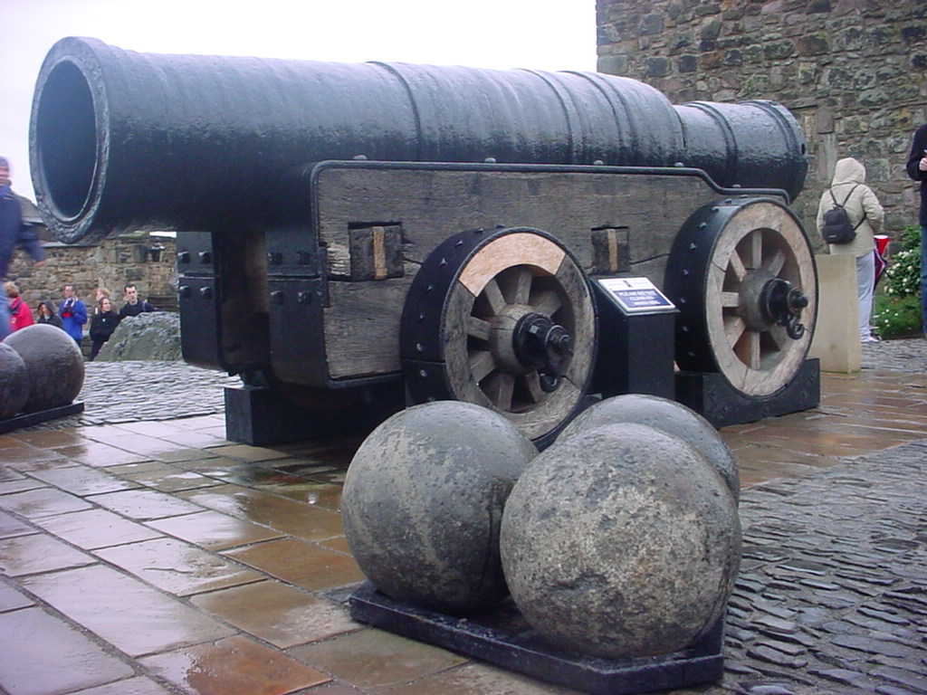 Mons Meg, a 6 tonne battle cannon which sits in Edinburgh Castle, was presented to King James II in 1457 and used against the English to good avail. The weighty projectiles were often found up to two miles away. It was last fired in salute in 1558 when the barrel burst.