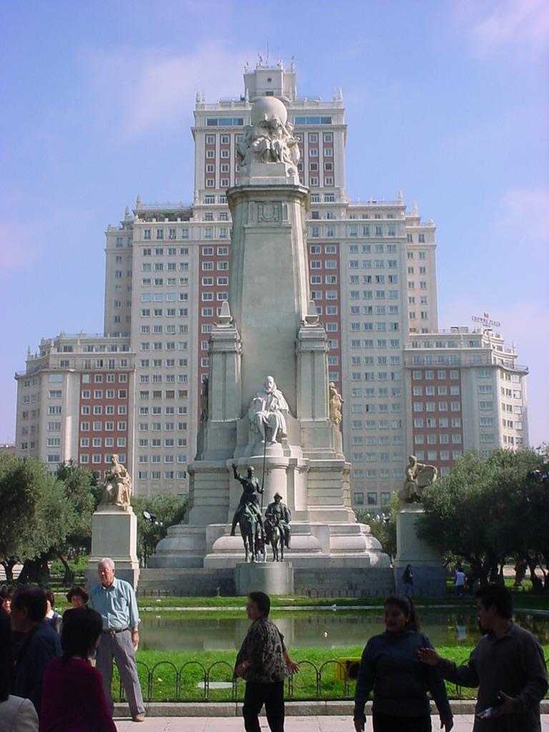 Plaza España, the next in the continuing series of Plazas in Madrid that we are working our way through. The three statues in the middle are of Don Quixote, Sanchopanza and Miguel de Cervantes who wrote the famous story about Quixote fighting the windmills. The building in the background is Edifício España, part of which is a hotel.