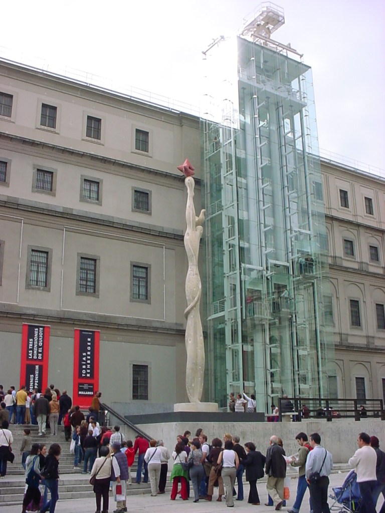 I took a quick trip up to Puerta de Europa to see these two offices, when I visited in 2002 they were the only inclined large commercial buildings in the world. The only similar building I had seen at this point was the Olympic stadium in Montreal. Scale is an illusion in this photo, as the sculpture in the middle is around 30 feet high to the towers’ 24 storeys and 350 feet.