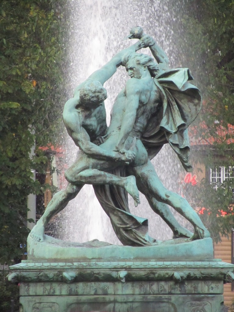 This dramatic statue caught my eye as we wandered back to the hotel, it is of two knife-wielding fighters bound together by a belt, and is called Bältespännarna. The fountain behind adds nicely to its raw feeling.