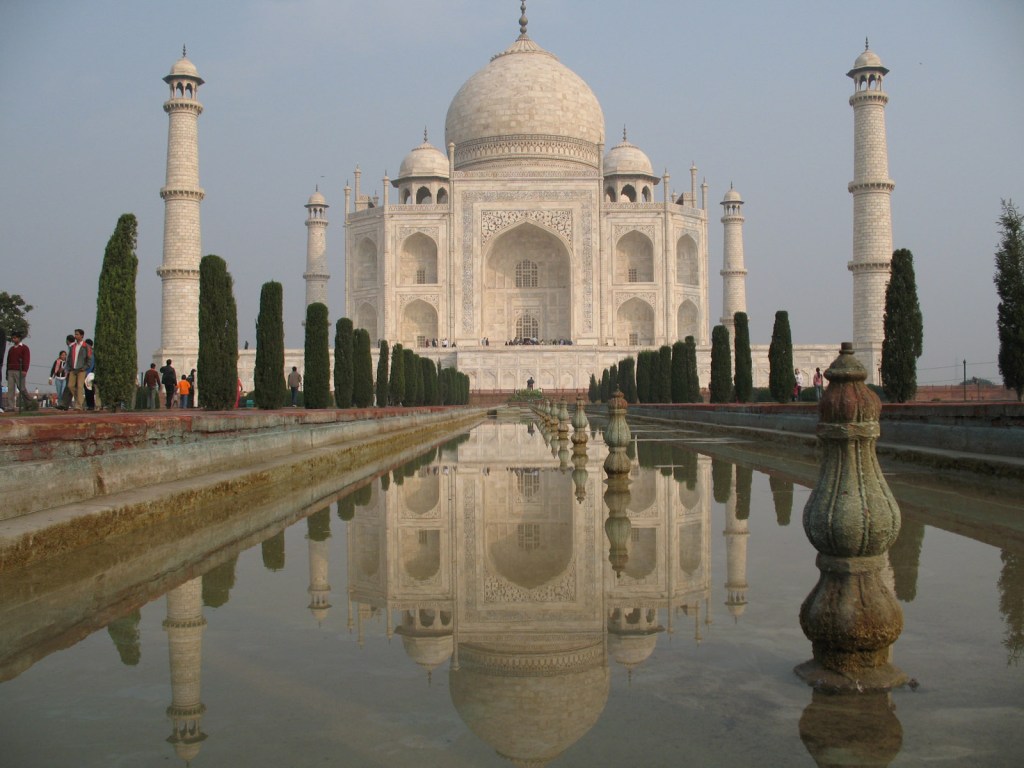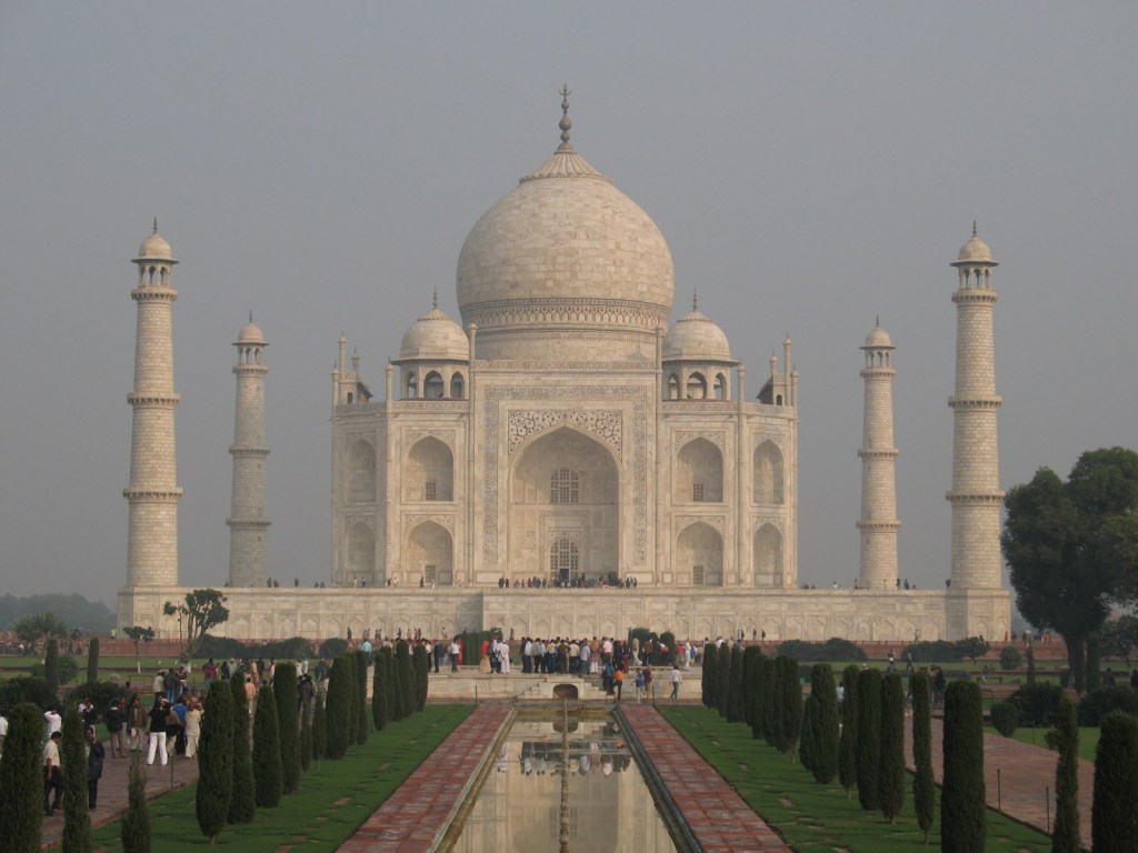The classic view of the Taj Mahal, as seen from the gatehouse upon entry. The name Taj Mahal translates as Crown Palace.