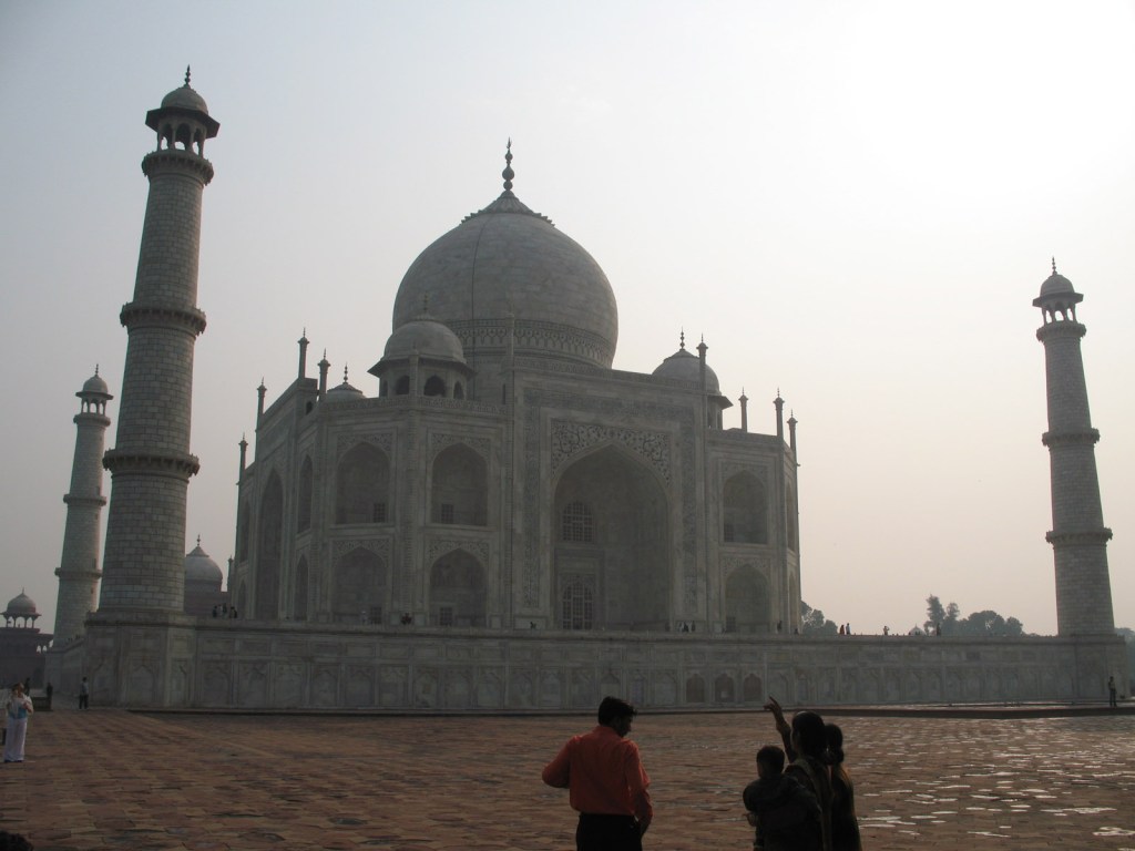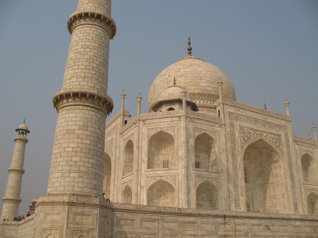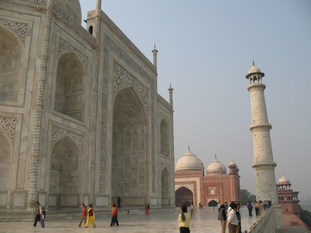 Around the back of the Taj Mahal. Each of the four minarets was built at a slight incline away from the main building, so that if there was an earthquake they would fall outwards, to mitigate overall damage.