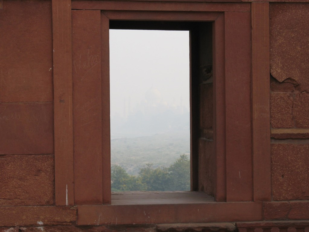 The local pollution does its best to thwart views of the Taj Mahal from Agra Fort, but you can just see it through the haze behind the trickle of the river. If you don’t believe me, look closer!