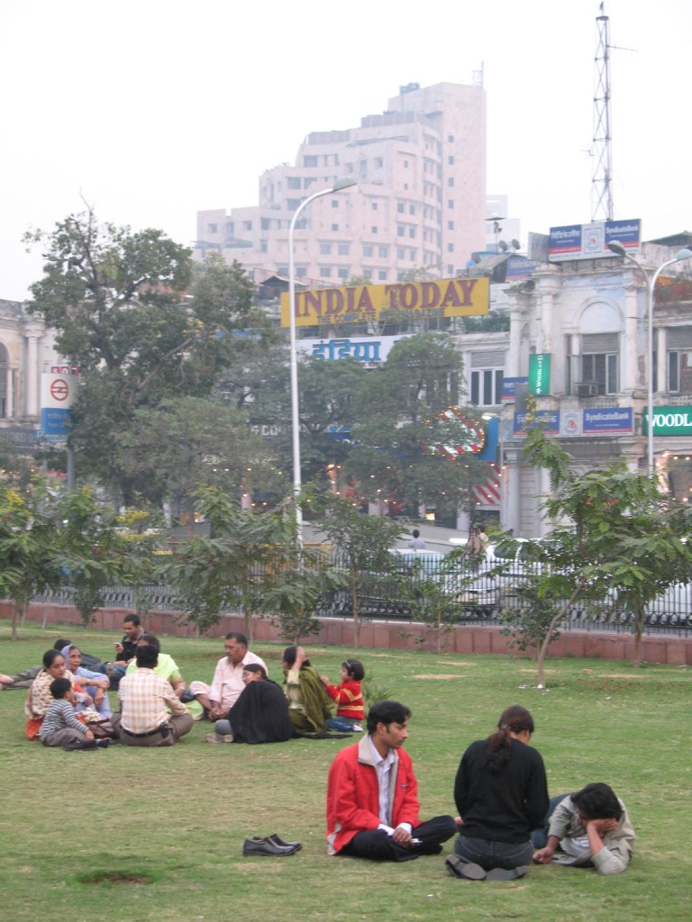 Connaught Place is the central business district of New Delhi, laid out in concentric rings surrounding an open green space. It was the closest thing to a public park that we found, although we still had to go through metal detectors to get inside. In the background is The Statesman Building.
