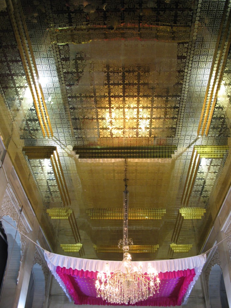 The golden ceiling inside the Gurdwara, reflecting some of the faithful below.