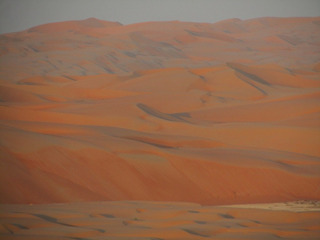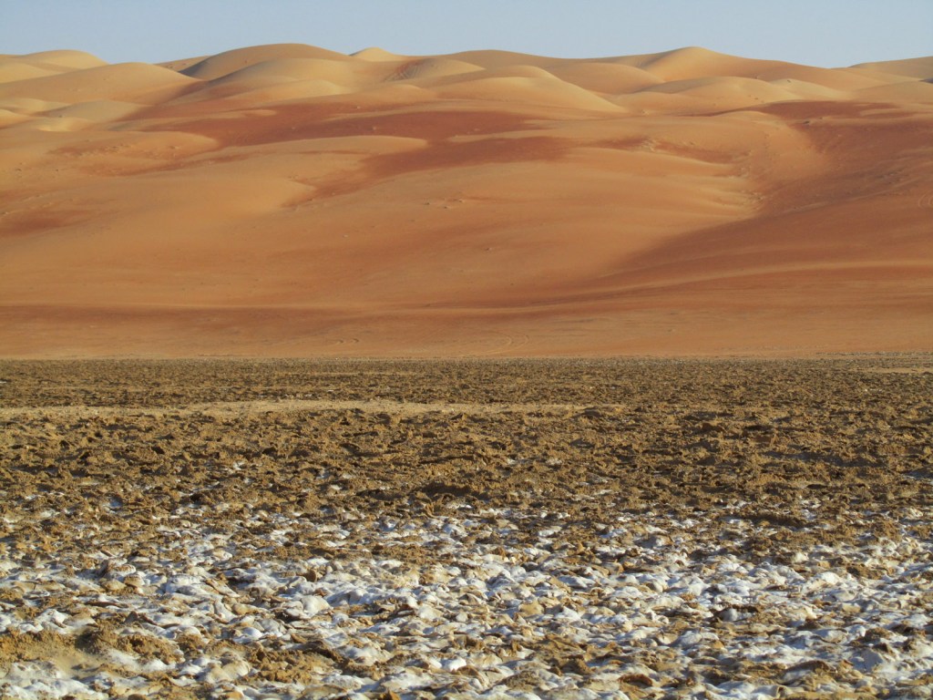 Sabkha or salt flats provide easy flat crossing between the dunes. These are left over from ancient floods, and the dunes slowly shift over them. I really like the blue-red-brown-white layers of this image.